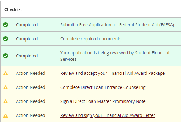 The checklist is designed to walk you through the important steps of the financial aid process. Completed steps are green and outstanding steps are yellow. Steps that require other steps in the checklist to be completed first will remain grey until the required steps are completed.