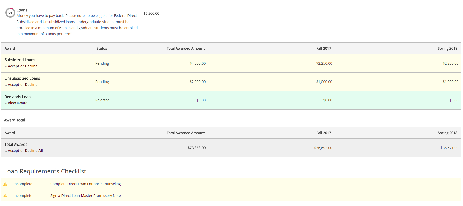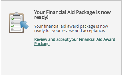 • Review and accept your Financial Aid Award Package*– your financial aid award has been prepared and is ready for review. All grants and scholarships are auto-accepted, however loans should be accepted or declined as appropriate