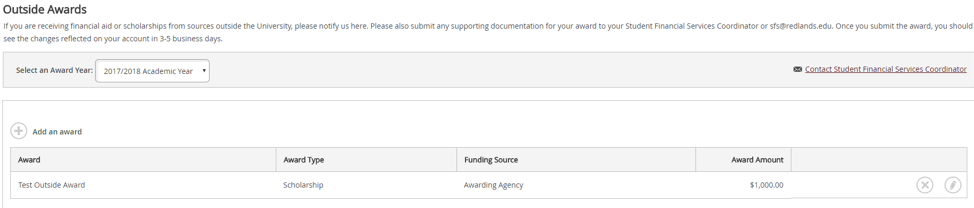 You can use this page to report any awards you are receiving from outside agencies, for example scholarships or tuition assistance. Please send any supporting documentation for your outside scholarship to your Student Financial Services Coordinator or sfs@redlands.edu.