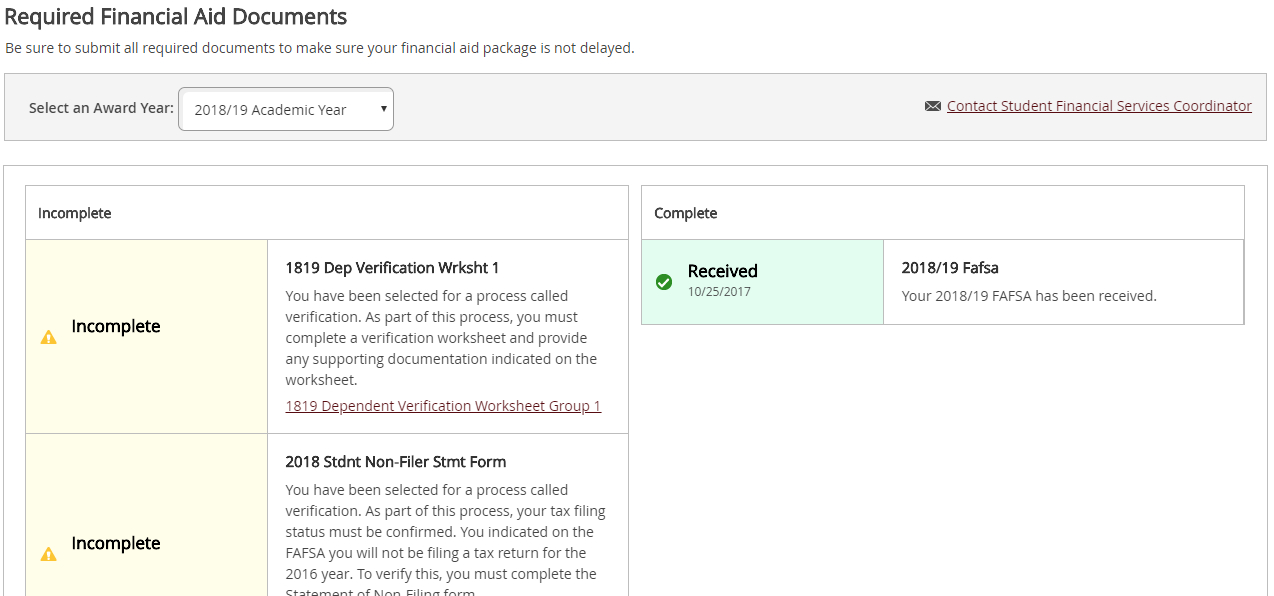 In some cases, additional documentation is required to prepare your financial aid award. Please review and complete any items in the “Incomplete” list on this page for your financial aid award to be prepared. We recommend all requested documents be submitted via the Student Financial Services Online File Submission page for fastest processing times.  If you prefer, you may fax documents to 909-335-5399 or mail to: Student Financial Services 1200 E. Colton Ave Redlands, CA 92373.