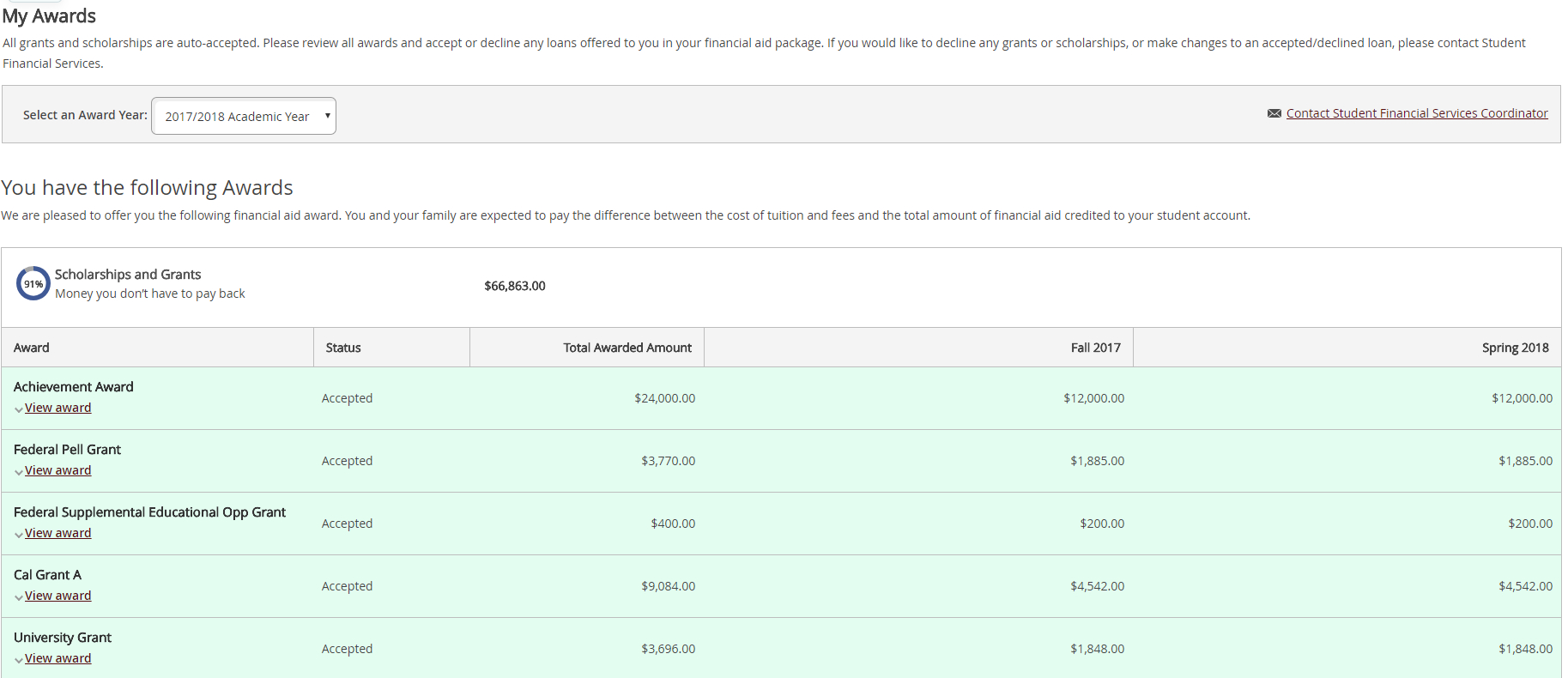 The My Awards page displays all awards offered to you for the specified award year. All grants and scholarships are auto-accepted.