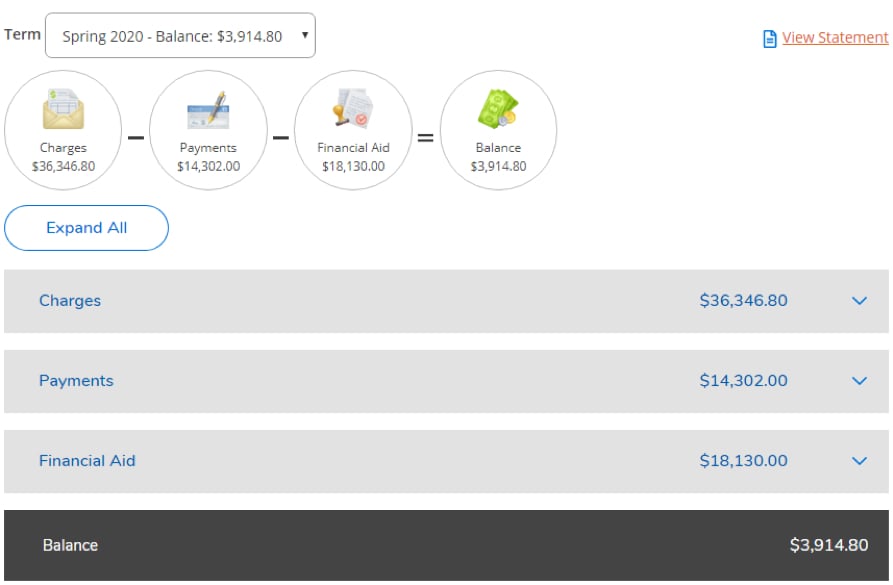 Select "View Statement" to generate a PDF version of your term statement. (If you need a chronological statement and/or a statement that shows more than one term, please contact Student Financial Services.)