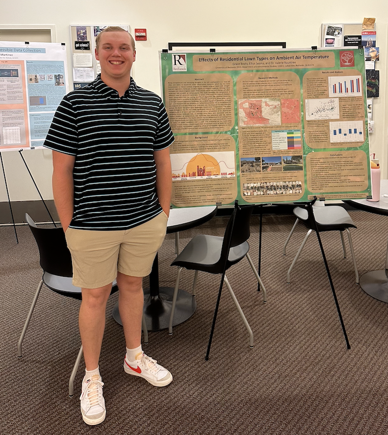 ES: I believe this research will help a lot more than just myself in the future. Our findings will hopefully help homeowners and landscape managers make informed decisions when addressing water scarcity and urban heat island exacerbation and help them understand the tradeoffs between the two. As a bonus, we hope it helps educate the public on sustainable landscape practices. As far as it helps me in my professional goals, I think it is very helpful that I can enter a job with actual experience in forming answerable research questions, fine-tuning research methods, analyzing collected data, and showing how that data is relevant to our ever-evolving society. I was given a great opportunity to earn experience and it paid off by helping me round out my skills as a researcher and teammate.